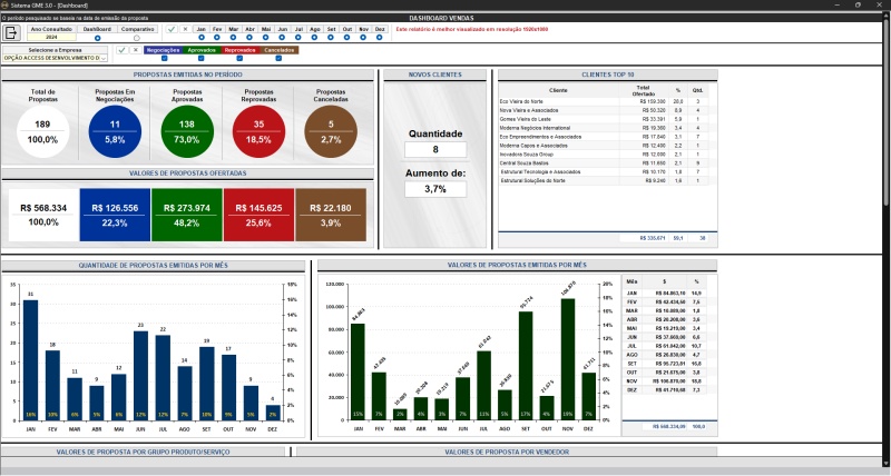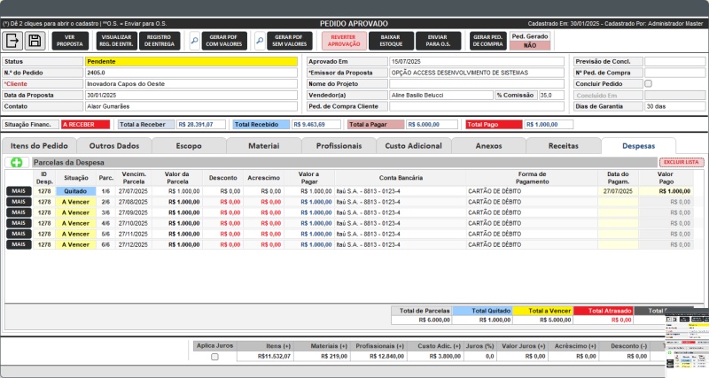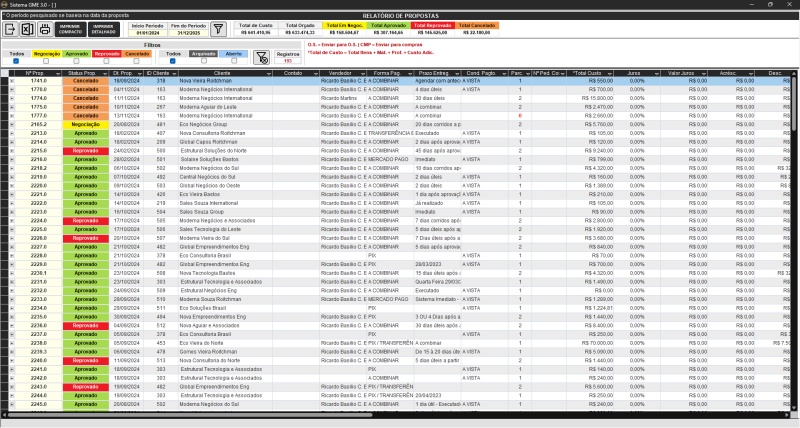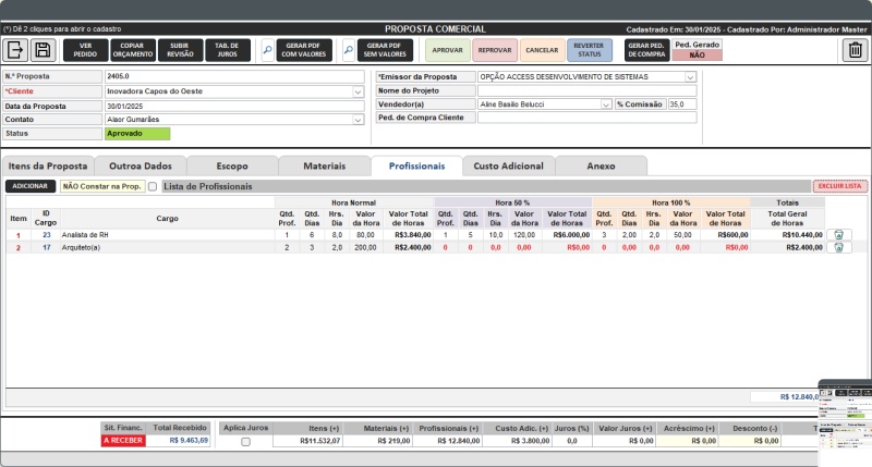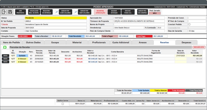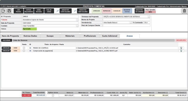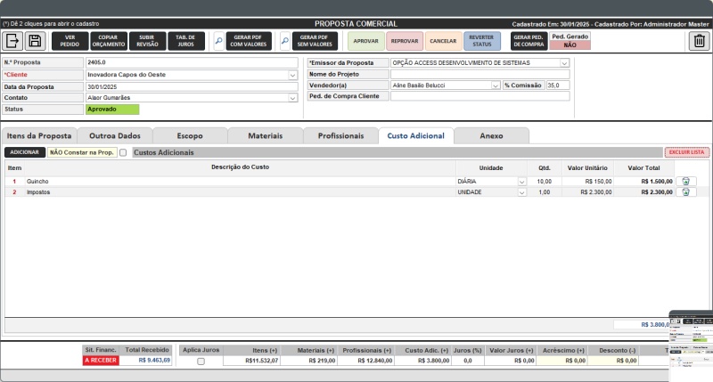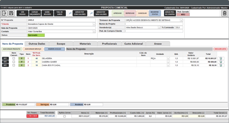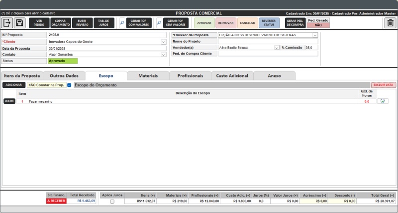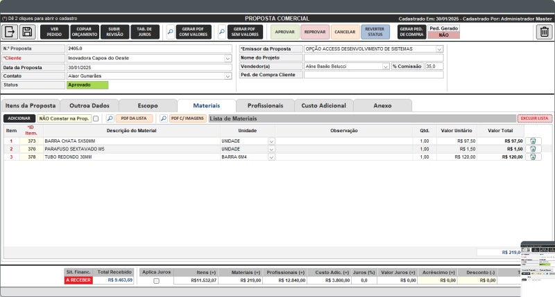 Crie propostas comerciais completas com produtos, serviços, materiais, profissionais e custos adicionais. Gere o PDF da proposta com um clique. Acompanhe propostas aprovadas pelo pedido interno, onde também é possível definir parcelas de recebimento e pagamento. Tenha uma visão clara do desempenho comercial com dashboard interativo e relatórios detalhados.